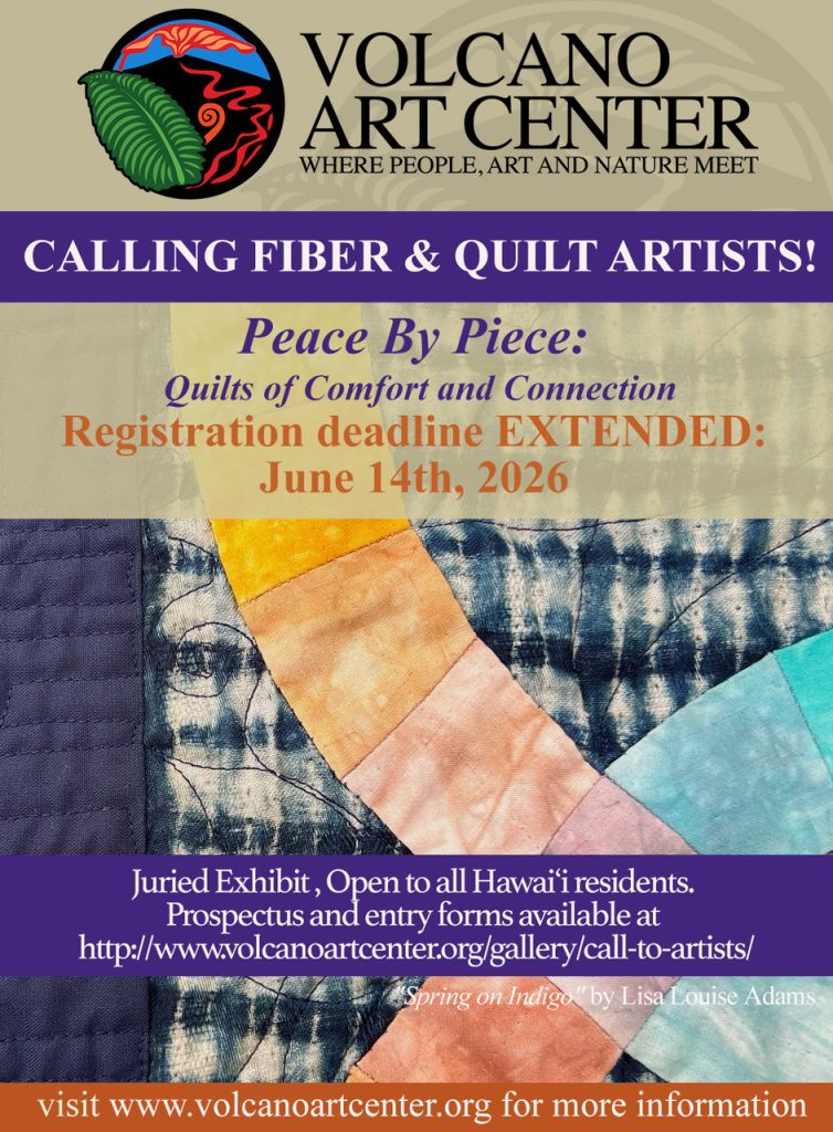 Peace By Piece: Quilts of Comfort and Connection Volcano Art Center (VAC) is proud to announce its 6th biennial quilt show, Peace By Piece.In Peace by Piece, we invite fiber artists and quilters to explore how fabric, pattern, and stitch become acts of care, healing, and unity. This year VAC invites fiber artists in various […]