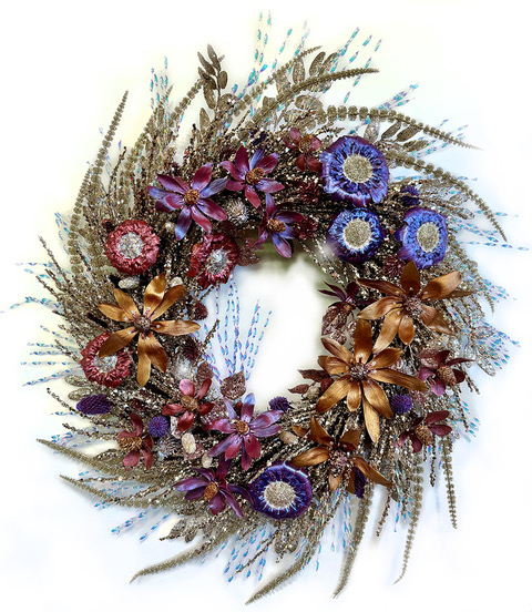 Materials: angel vine, protea centers, leucadendron, pincushion centers, faux foliage, iridescent twist picks.