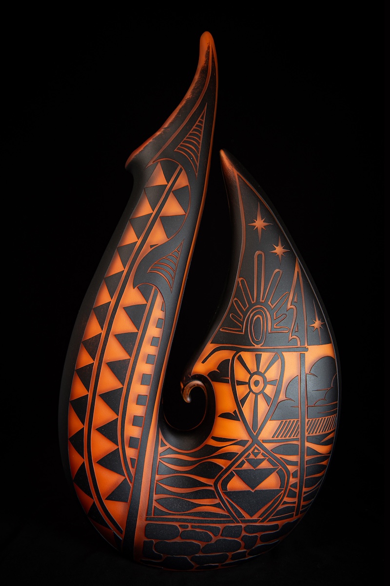 This piece of art is from the exhibition titled Voyage From Hawaiki: The Realm of Origins and Ancestors, on display January 10th through February 15th at Volcano Art Center Gallery in Hawaiʻi Volcanoes National Park.  Art work sold from this collection will not ship until after February 15th.