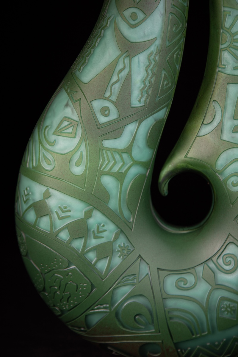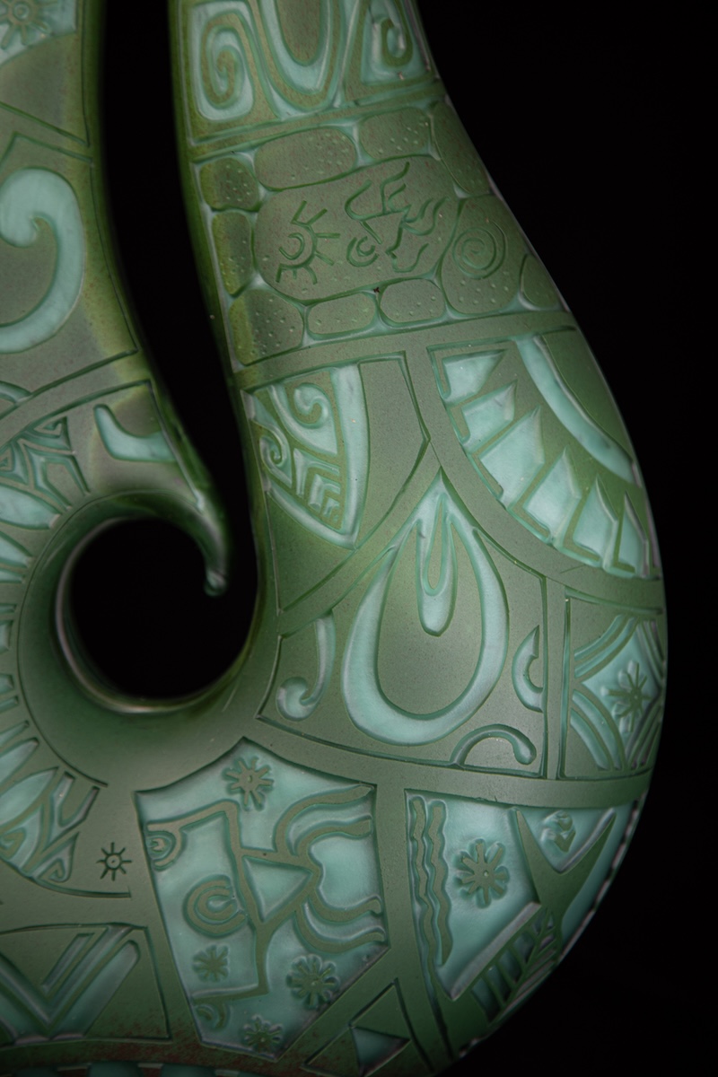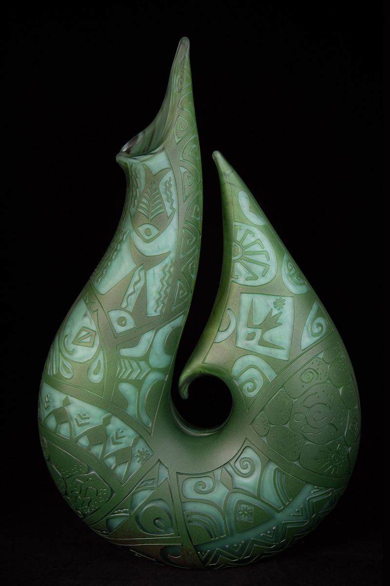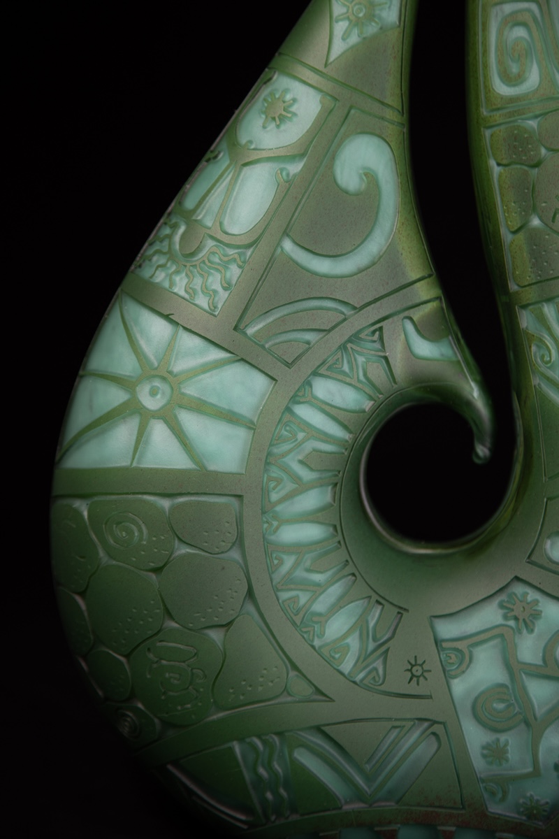 Handblown, carved and sandblasted glass Fishhook sculpture by Daniel Moe, made in collaboration with Tihoti